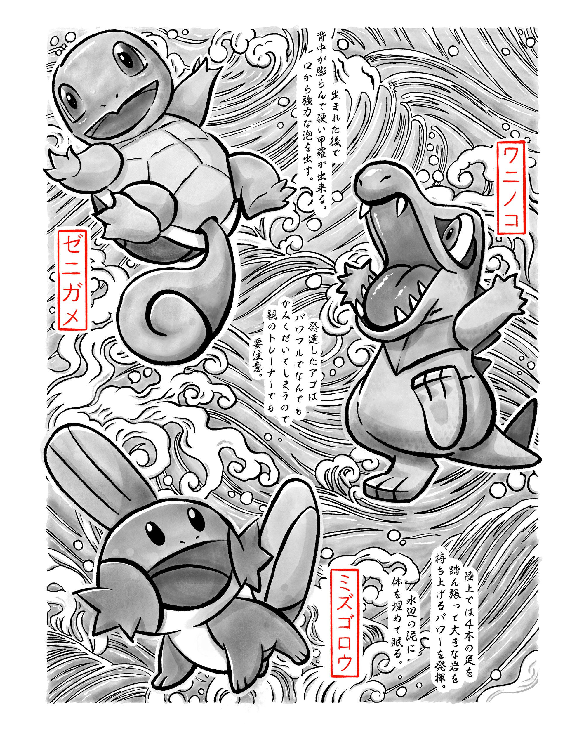 Text translation: Squirtle - After being born, their backs swell and a hard shell forms. They spit out powerful bubbles from their mouths. Totodile - Its well developed jaws are powerful and it can bite anything to pieces, so even its parent trainers should be wary. Mudkip - On Land, it exerts enough power to brace itself on all four legs and lift large rocks. It sleeps by burying its body in the mud at the water's edge.
